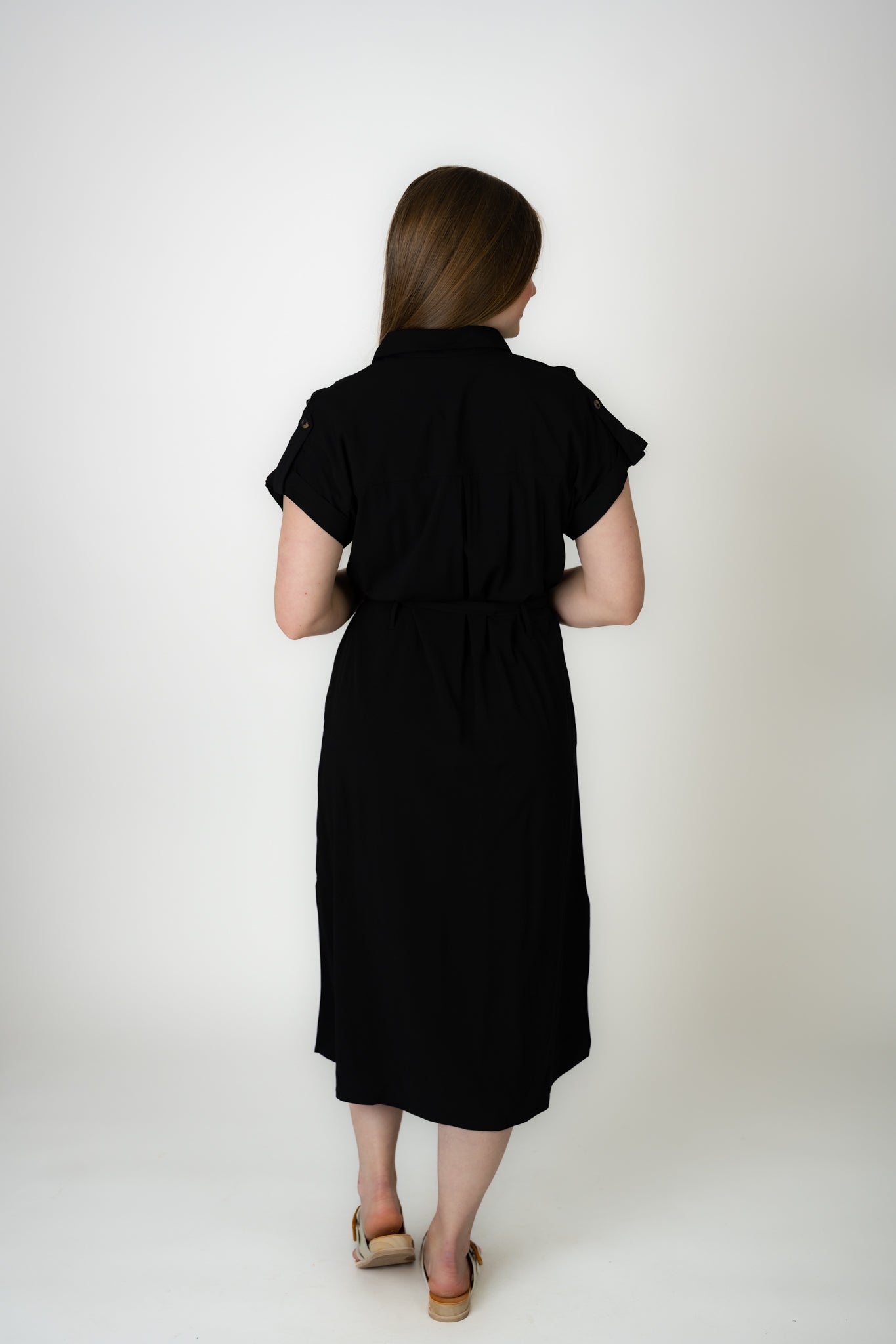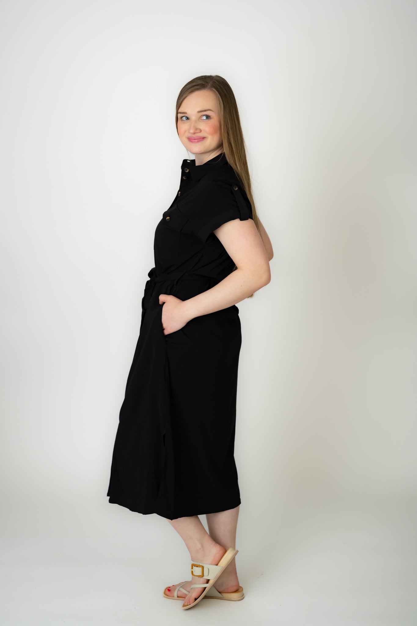 We are loving this dress! Such a great style and fit. Lightweight feel with a waist tie and side slits. Fits true to size.
