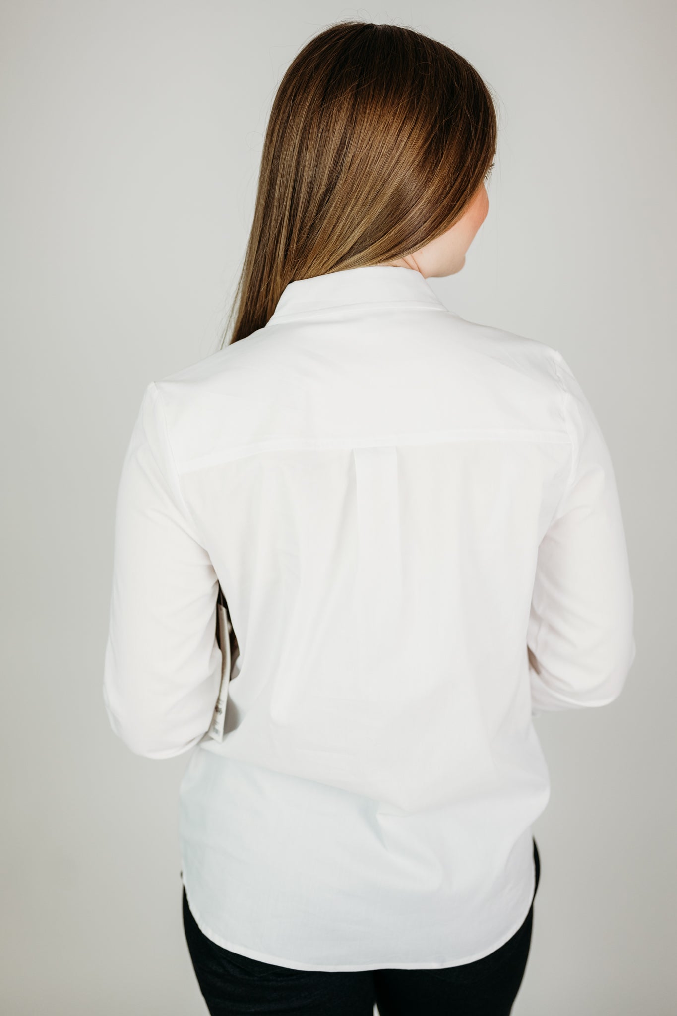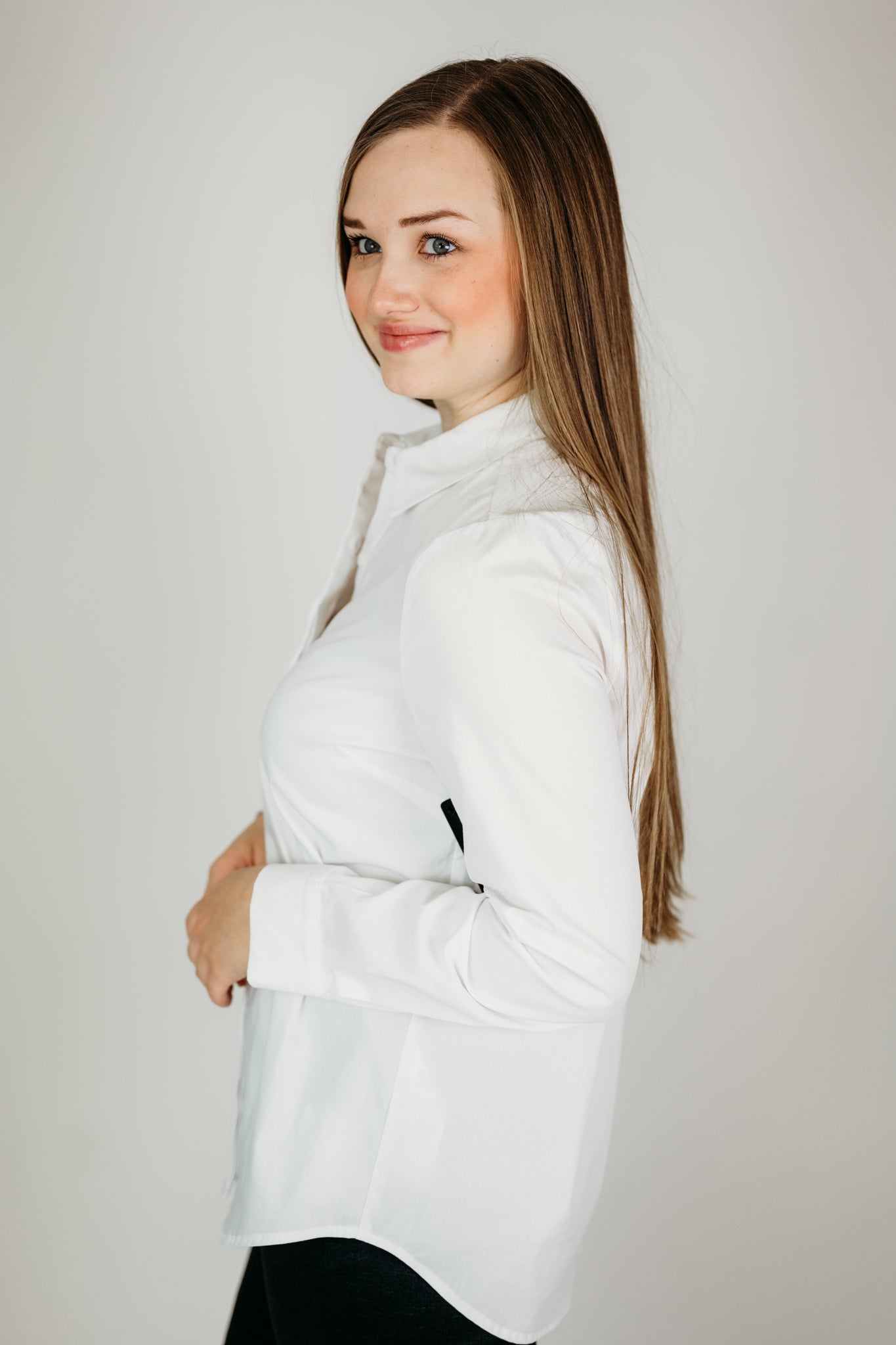 The beautifully tailored white hidden placket shirt fills the hole in your closet! Reach for this without even thinking! The perfect versatile shirt that can be worn for work or casually with denim.