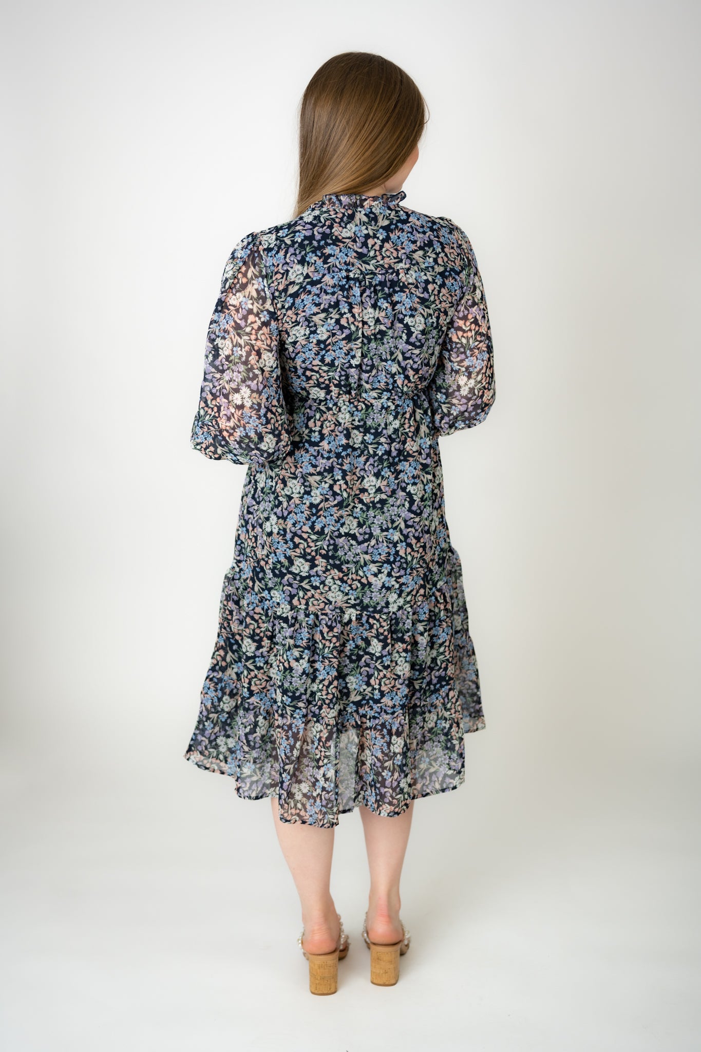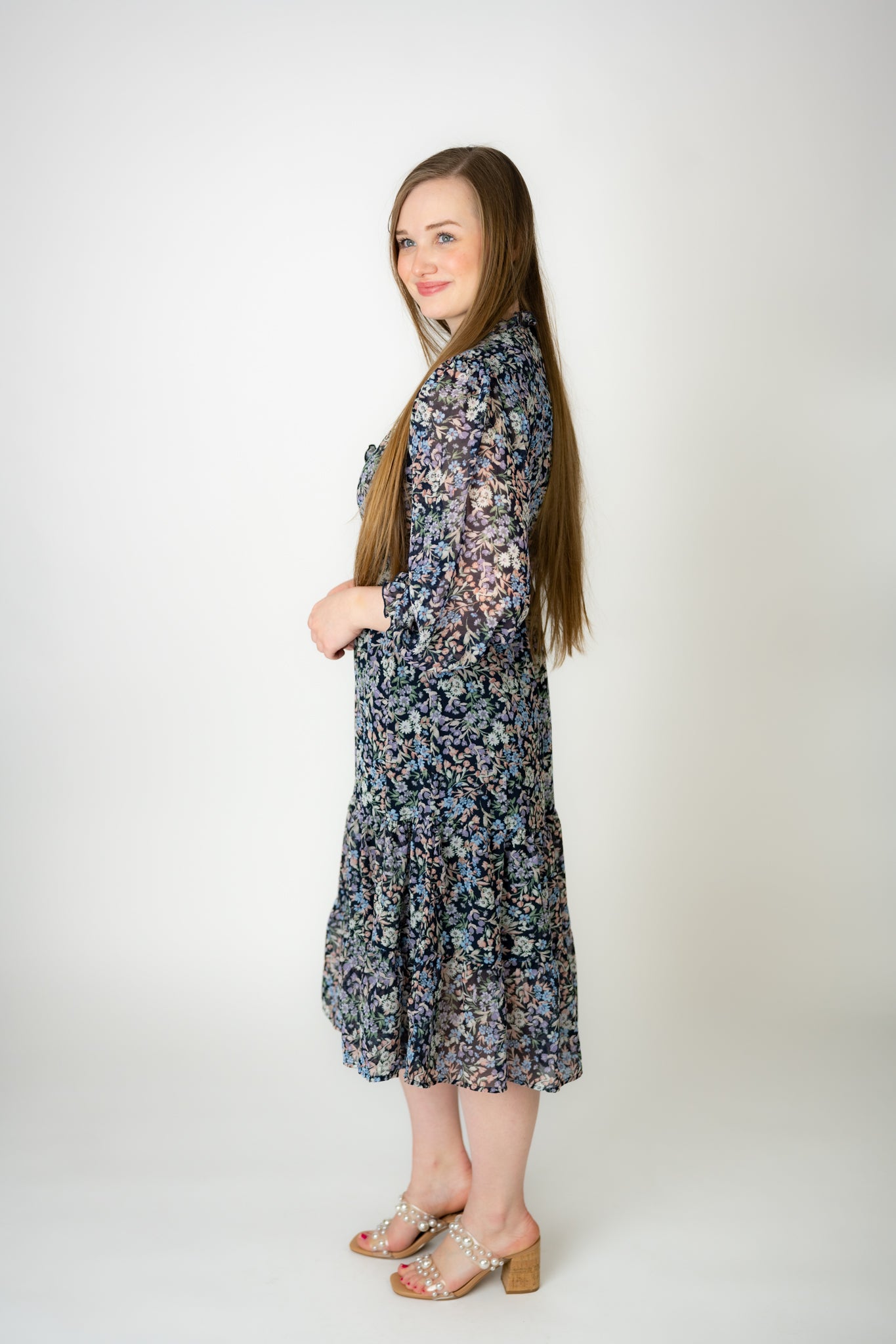 This is such a fun dress with the ruffles and small floral print. Sheer sleeves with elastic at the wrist and an elastic waist. Fits true to size. Fully lined.