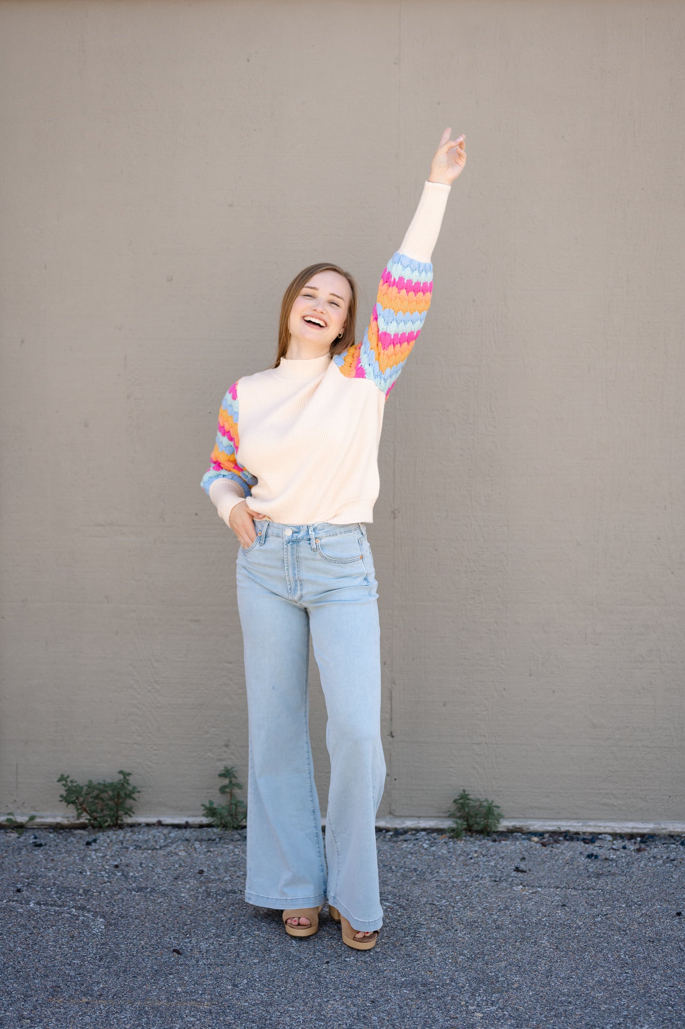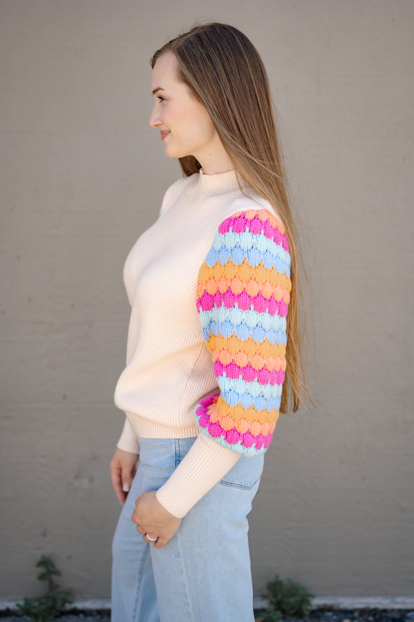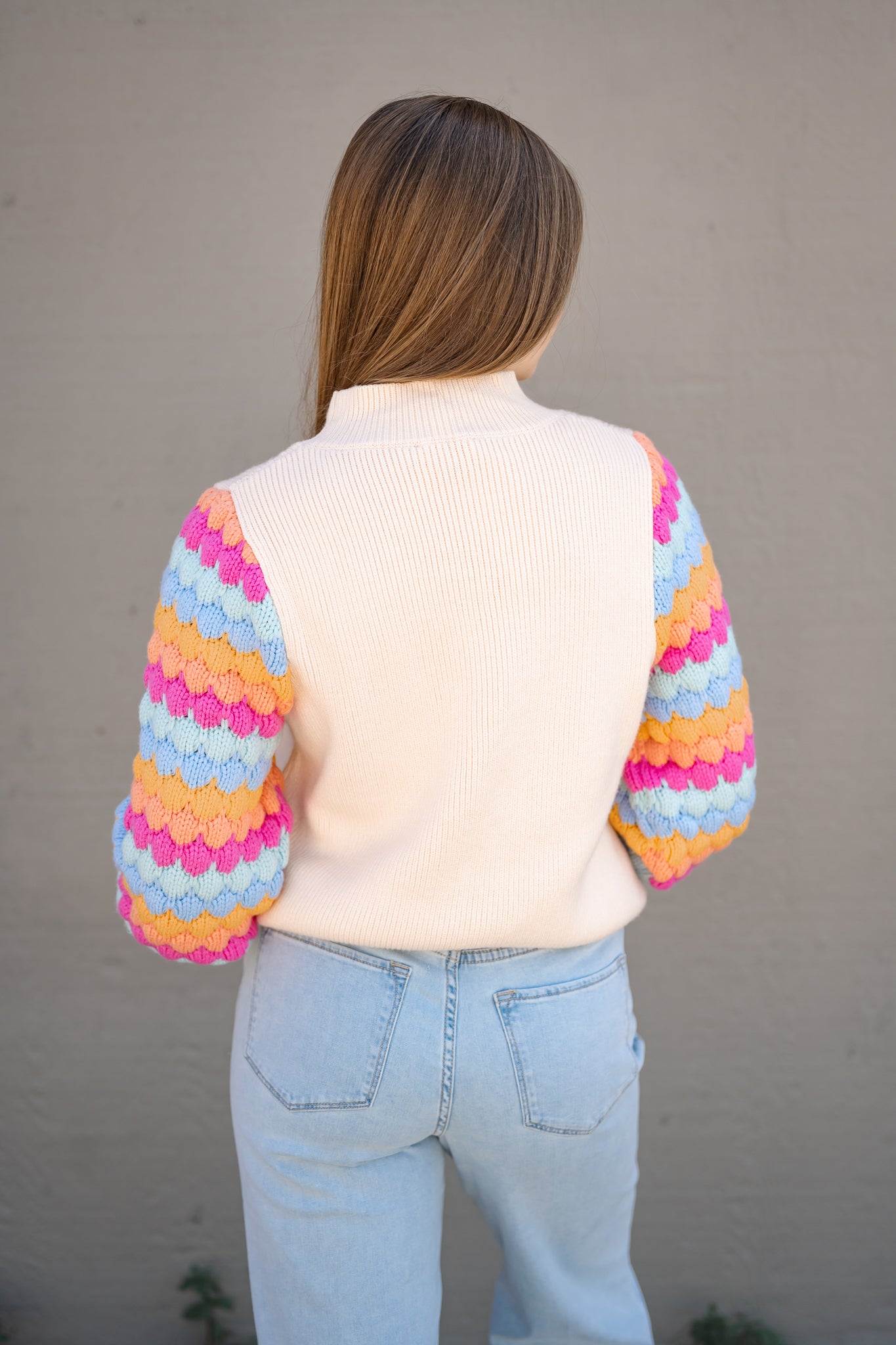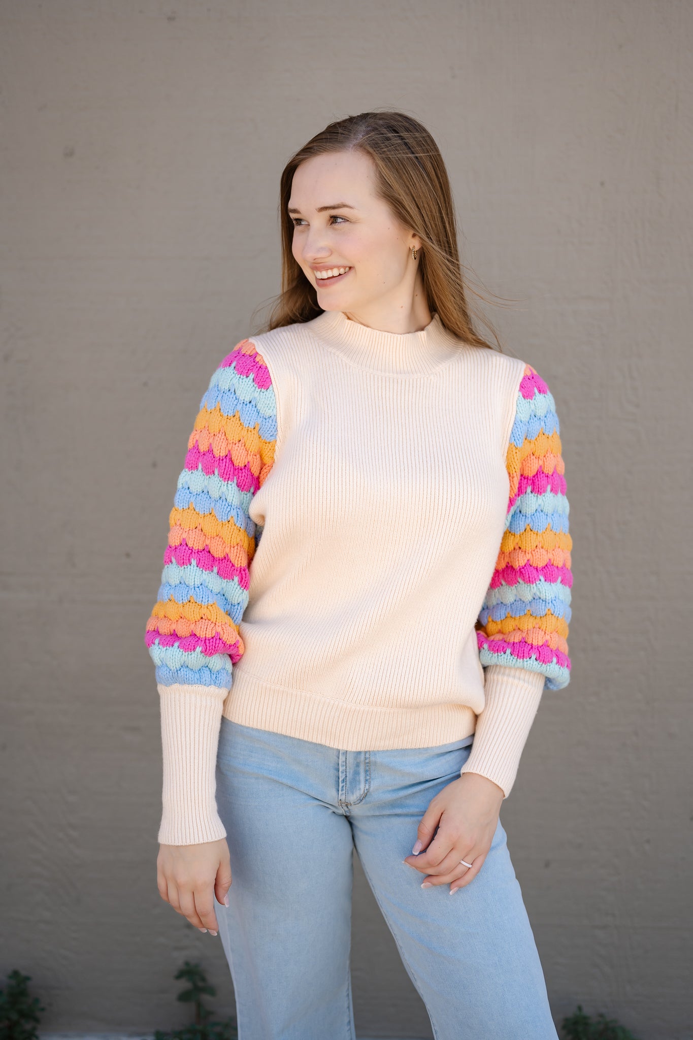 Such a fun sweater to brighten up the cold months! Fitted at the forearm with a bubble sleeve the rest of the way to the shoulder. Bright colored sleeves with a cream bodice. Fits true to size.