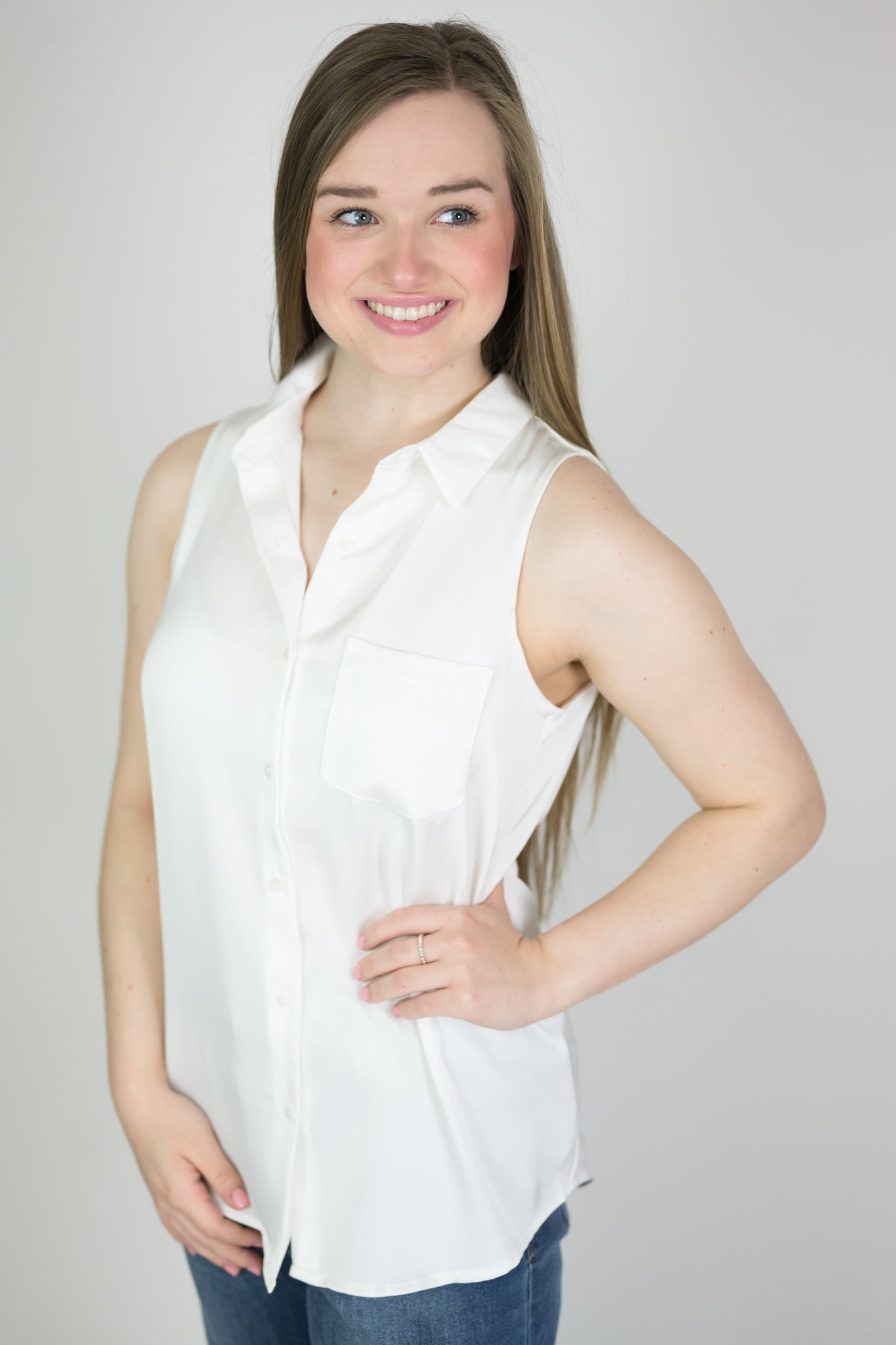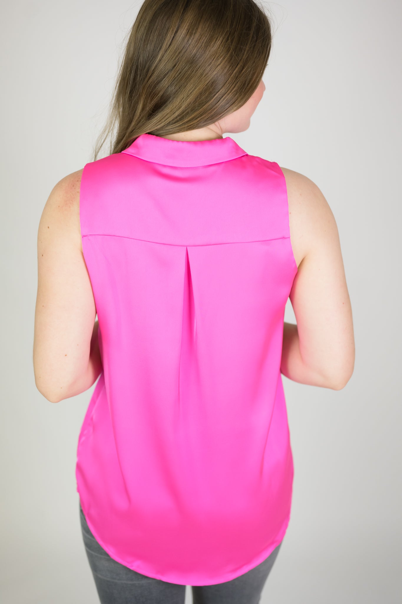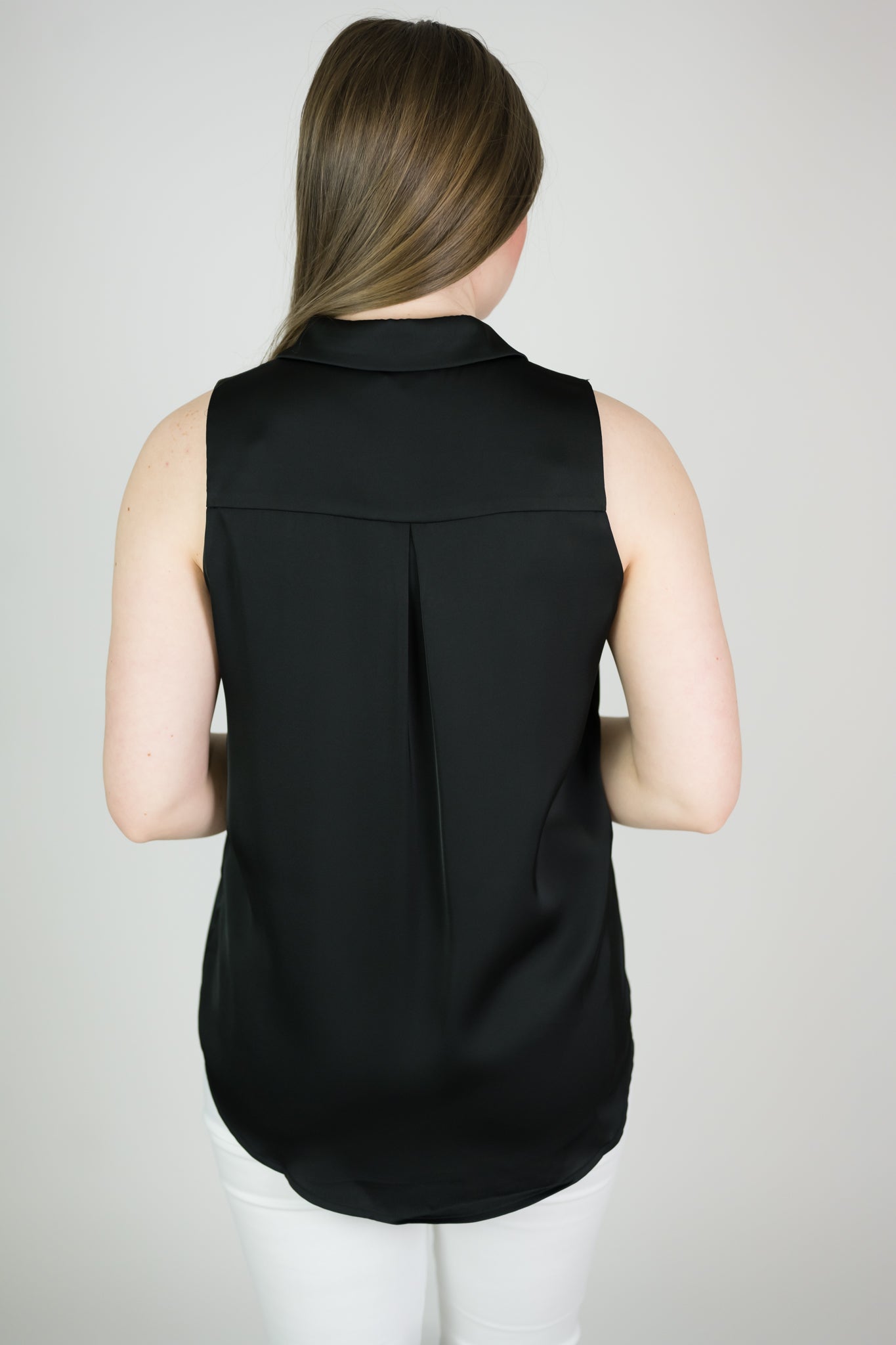 Sleeveless satin button down blouse. Collared and comfy, easy to wear. Fits true to size.