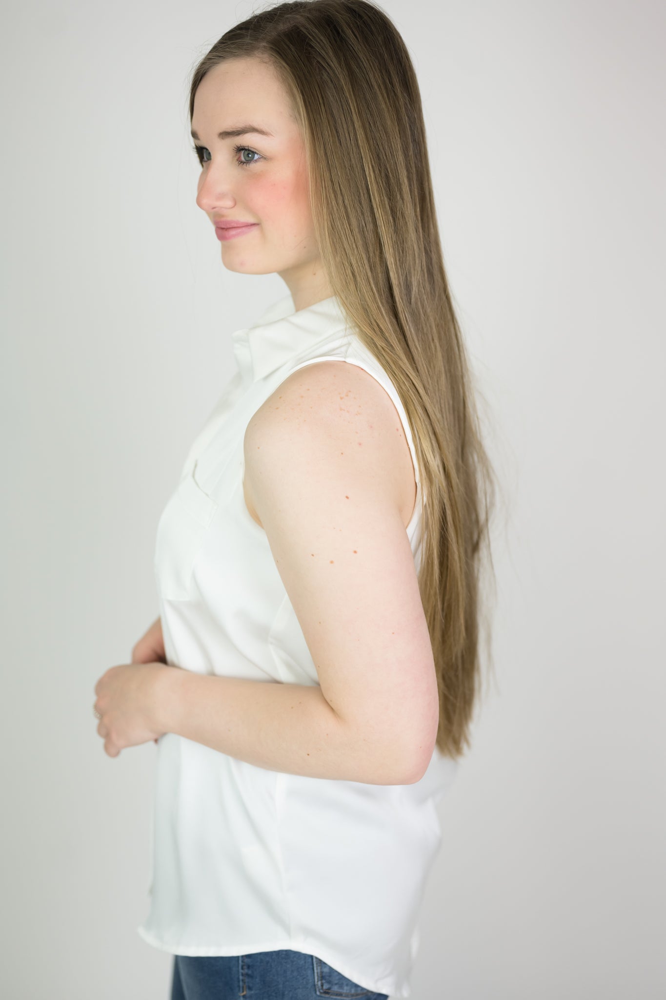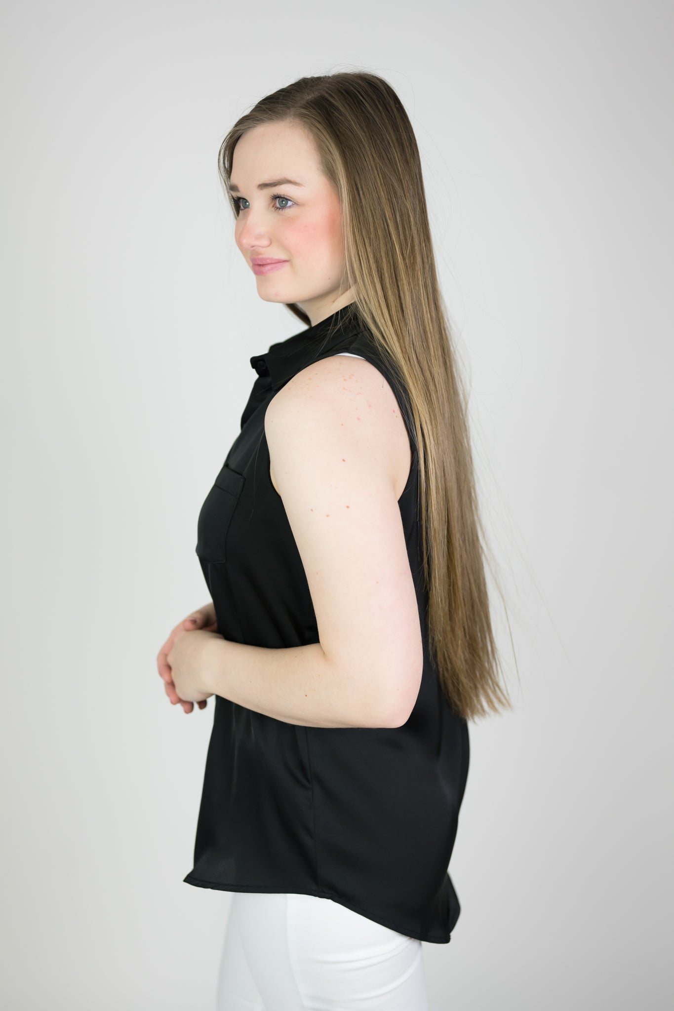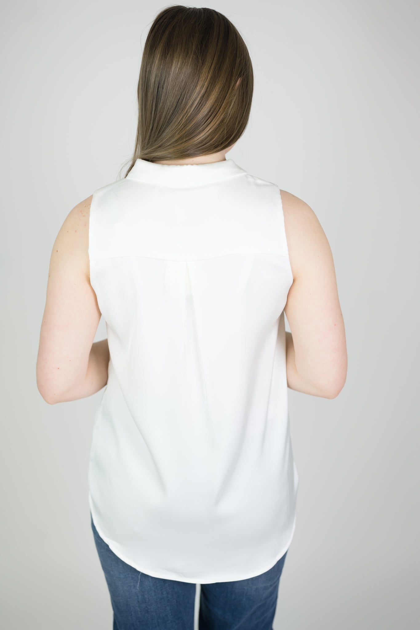 Sleeveless satin button down blouse. Collared and comfy, easy to wear. Fits true to size.